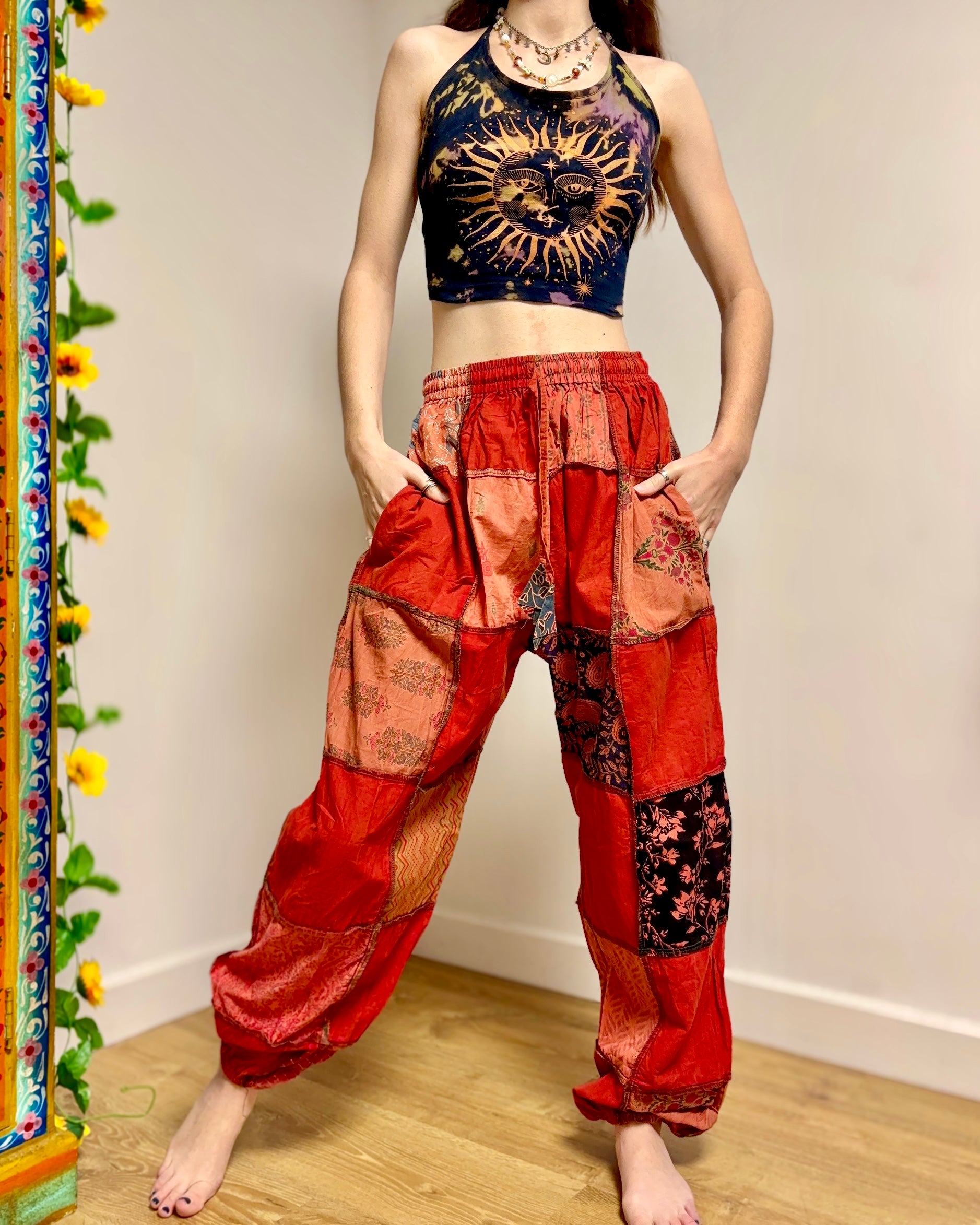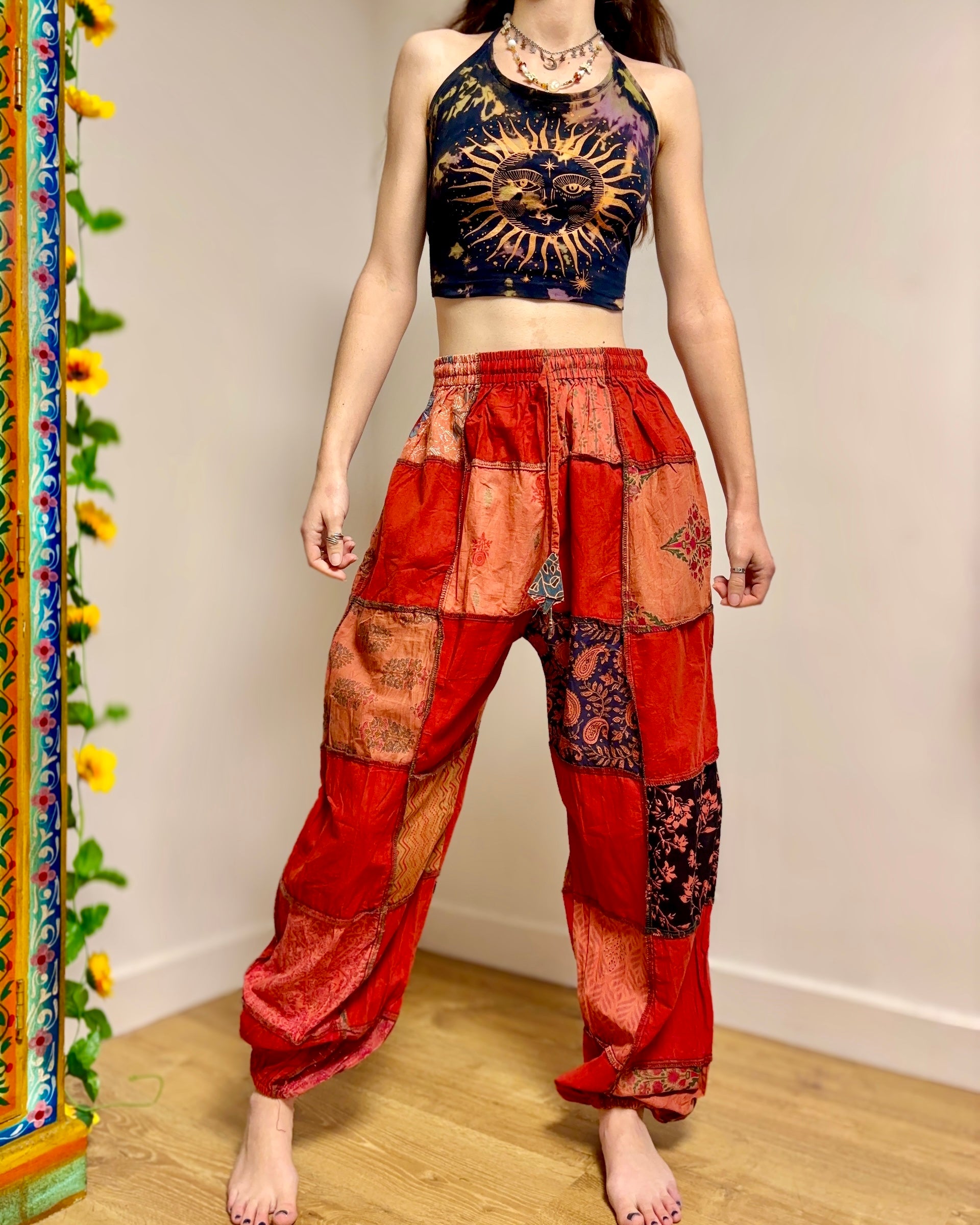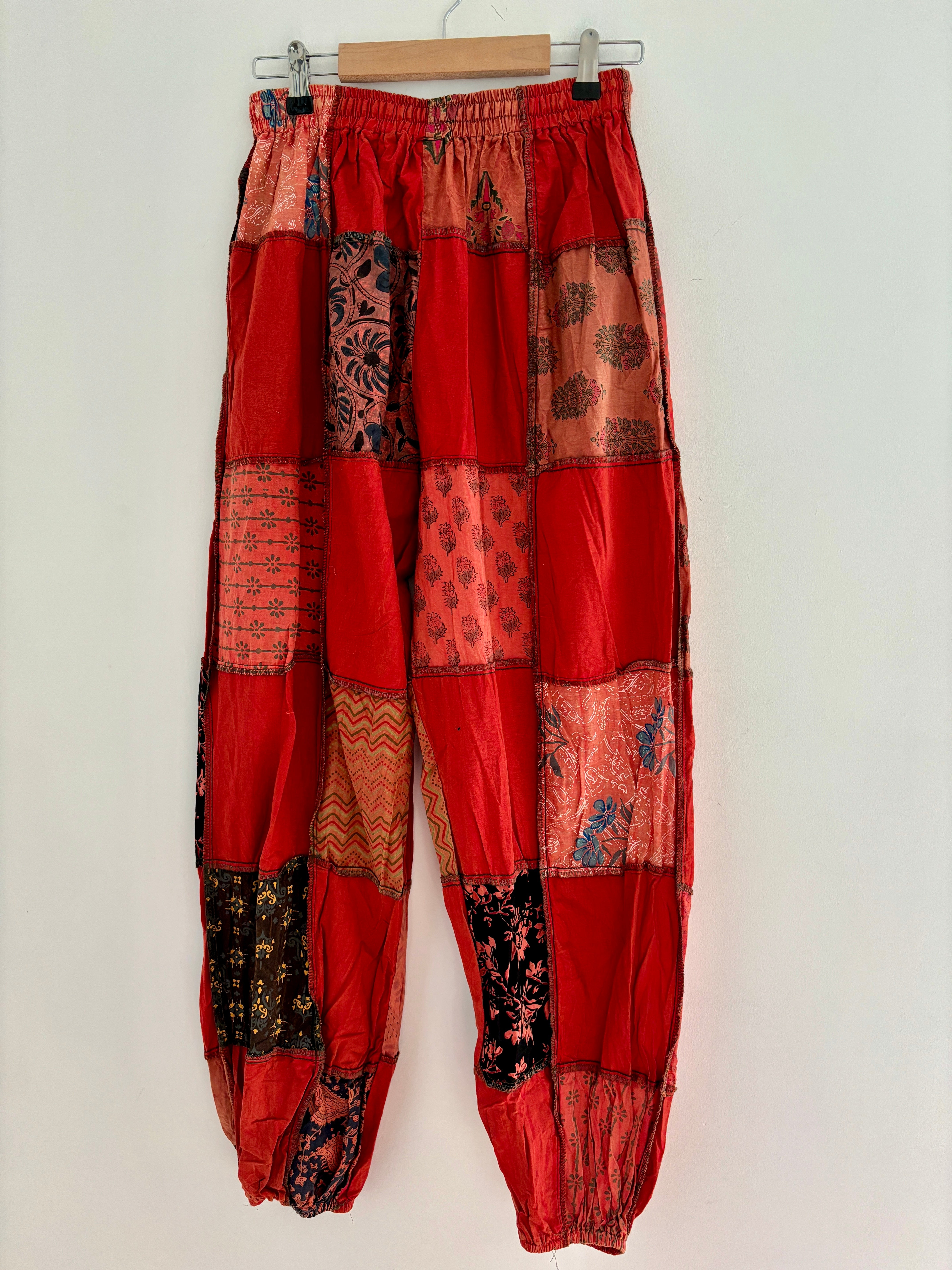 These new harem pants are made from patches of red fabric. They have an elasticated waist and 2 side pockets.