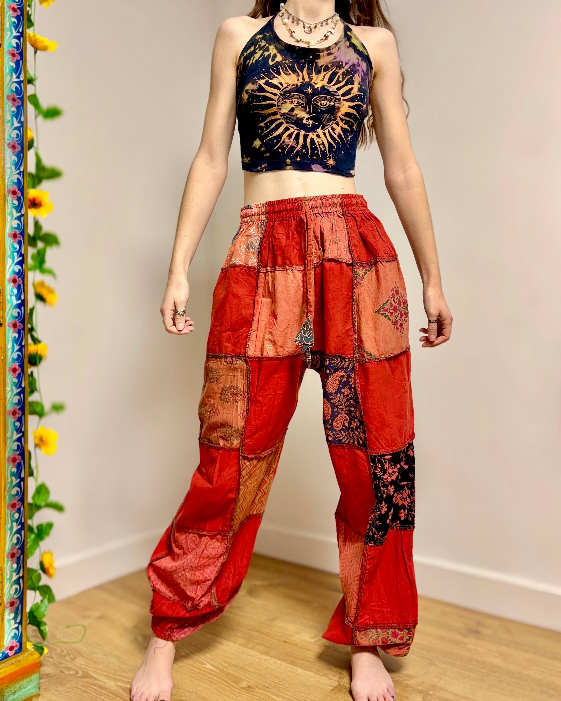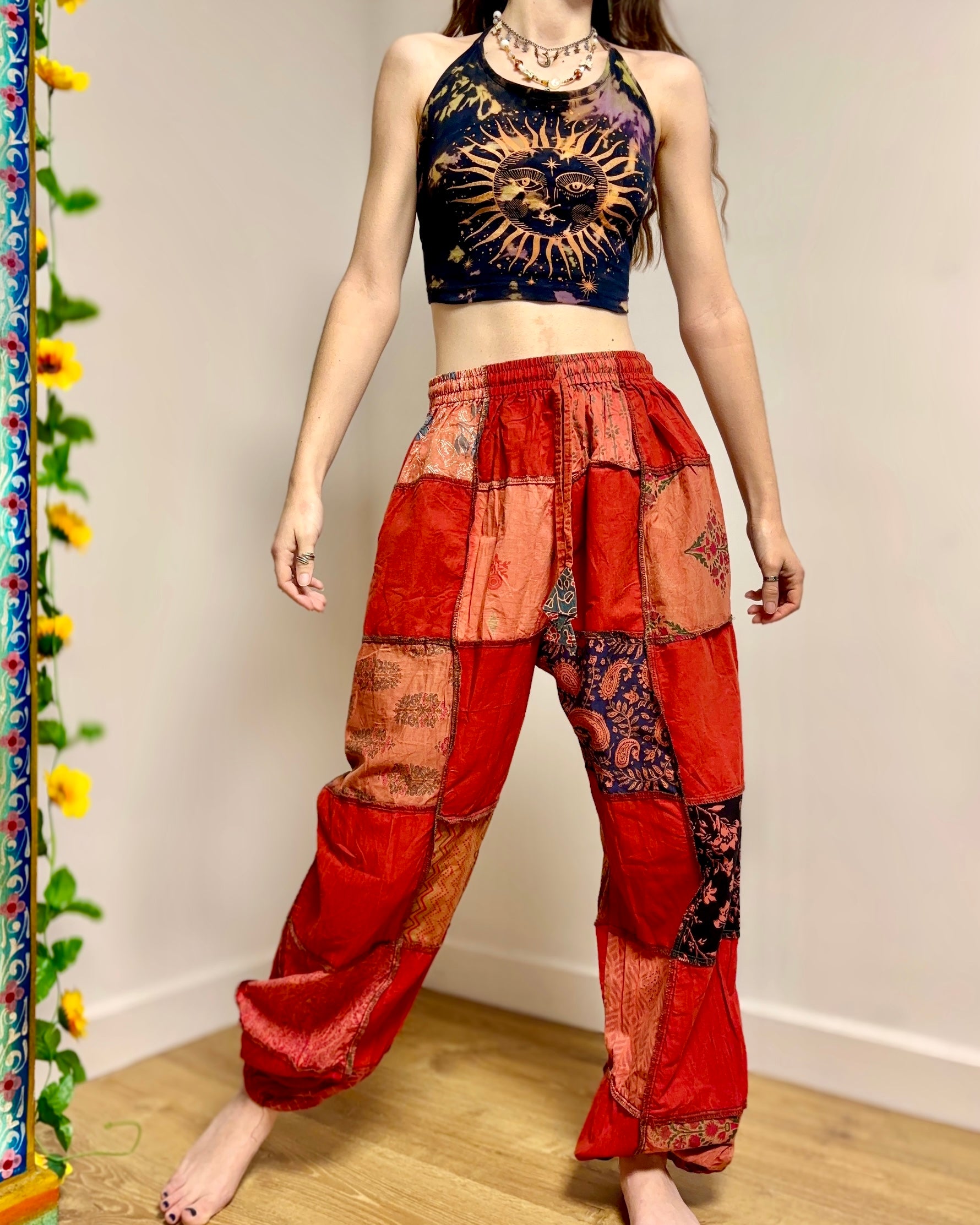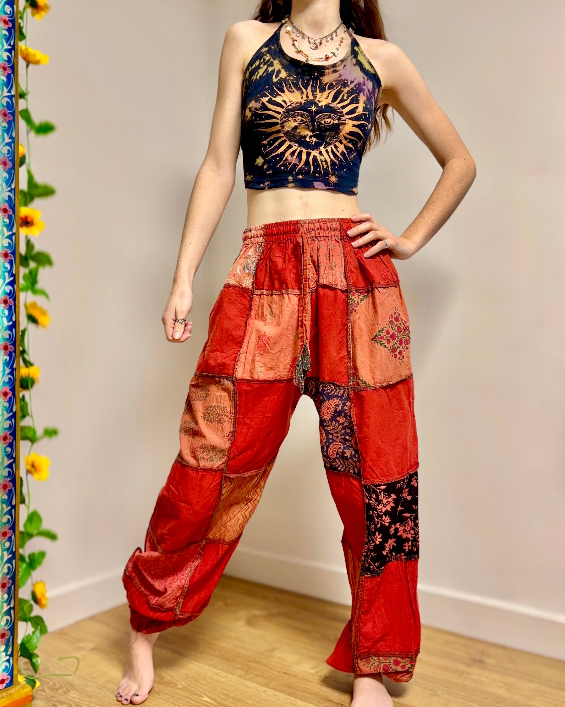 These new harem pants are made from patches of red fabric. They have an elasticated waist and 2 side pockets.